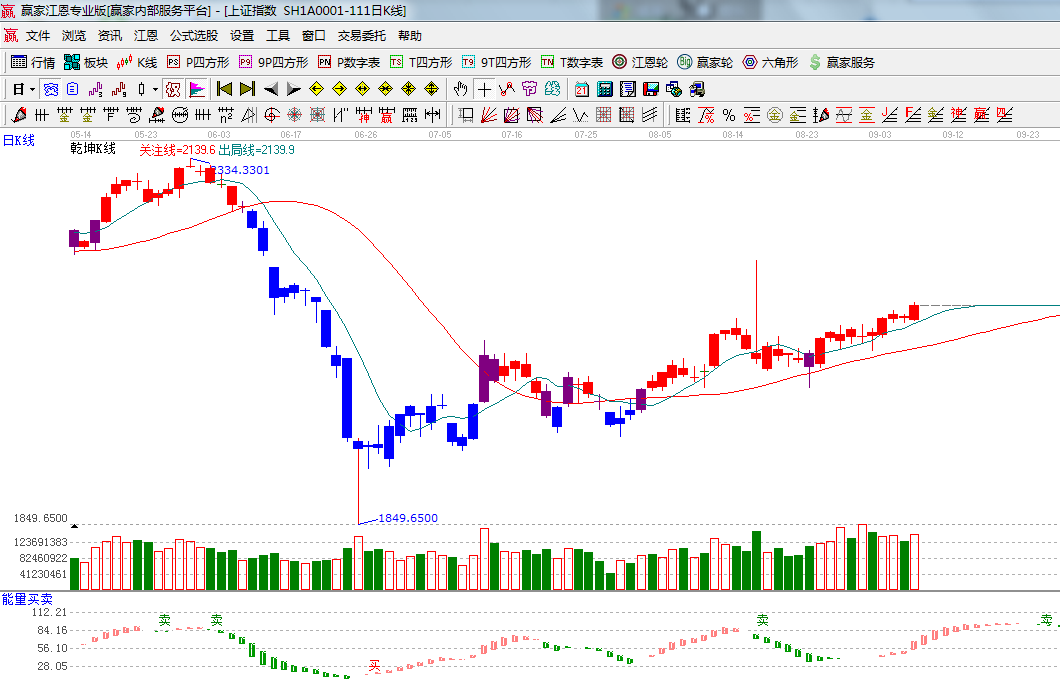 ★依據(jù)贏家江恩系統(tǒng)乾坤K線提示:出局線、關(guān)注線保持其頭并進(jìn),策略上以持股為主;(1)