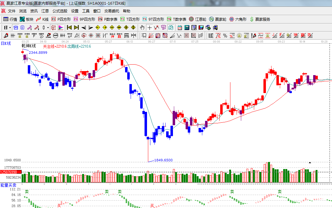 ☆依據(jù)贏家江恩系統(tǒng)波段百分比延伸提示:江恩百分比315度是2196,270度位置是2232;