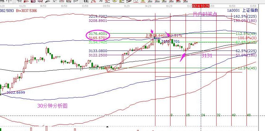 昨日分析及走勢(shì):昨日早盤分析中,給出的支撐是3120,壓力是3155點(diǎn),日內(nèi)時(shí)間10點(diǎn)。實(shí)際走勢(shì)為:最高3155點(diǎn),一點(diǎn)不差,日內(nèi)時(shí)間10點(diǎn)在3131止跌起漲,沒有完全回踩到預(yù)期的支撐,但時(shí)間為先,對(duì)照下方15分鐘圖和30分鐘圖,可以清晰的看到昨天市場(chǎng)的運(yùn)行軌跡。以前分享過這個(gè)經(jīng)驗(yàn),再說明一次:以兩個(gè)高點(diǎn)做等距周期,按照經(jīng)驗(yàn)對(duì)應(yīng)的下個(gè)時(shí)間見低點(diǎn)概率大,昨天的走勢(shì)再次驗(yàn)證了此成功率。15分鐘和30分鐘小雙頭預(yù)測(cè)了昨天的低點(diǎn)時(shí)間,大盤個(gè)股都通用,有心的朋友可以結(jié)合自己的股票試試奧。大盤生命線附近震蕩?kù)柟蹋瑑H作短線回調(diào)對(duì)待,3016和3022雙針引發(fā)的上漲遠(yuǎn)未結(jié)束,所以按照自己的策略執(zhí)行交易即可。