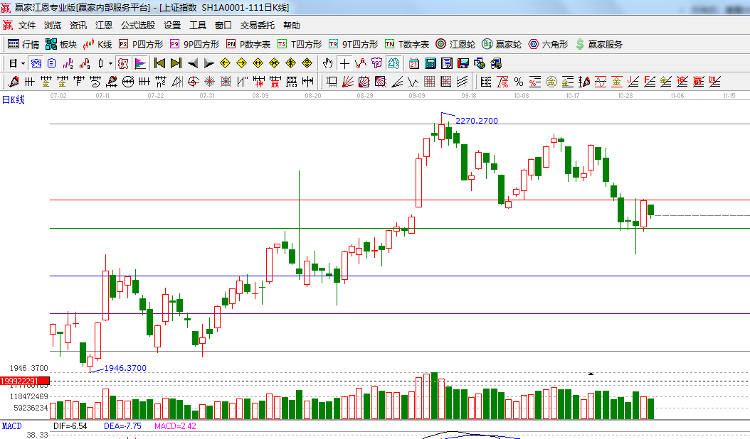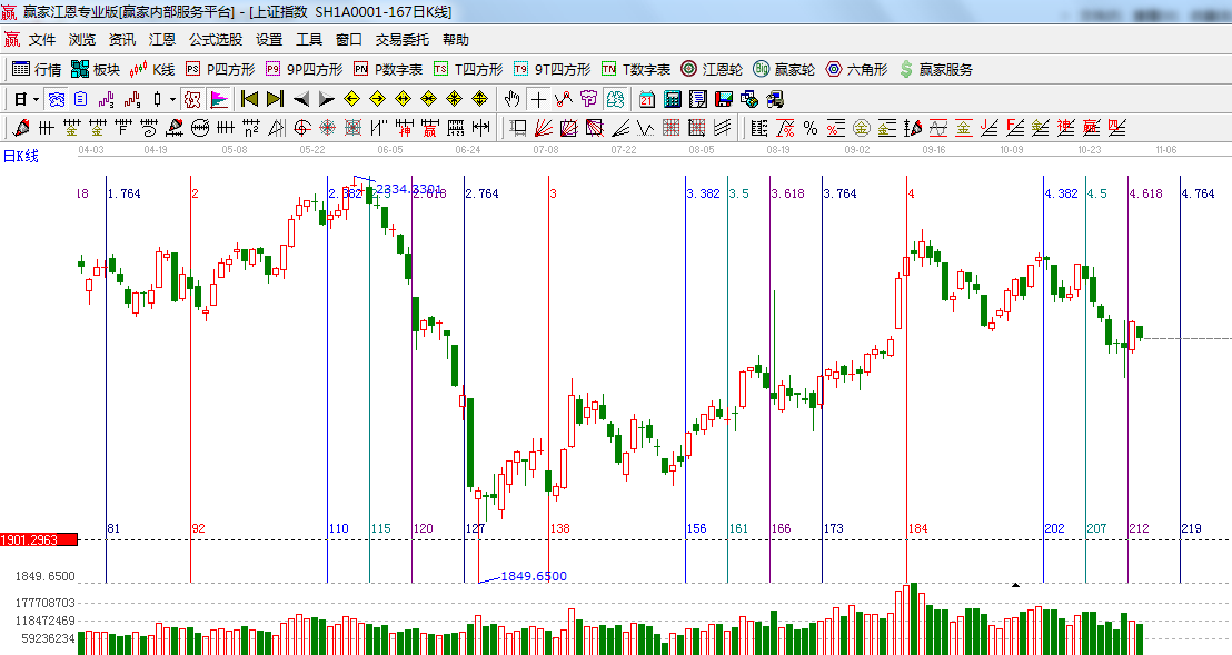 ★依據(jù)贏家江恩系統(tǒng)波段百分比延伸提示:江恩百分比0度是2160,45度位置是2125點;