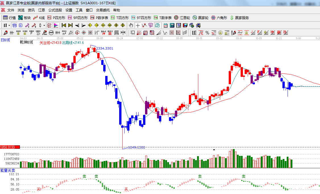 ☆依據(jù)贏家江恩系統(tǒng)乾坤K線提示: K線反抽短期出局線,藍色休息區(qū)以保守操作或空倉為主;
