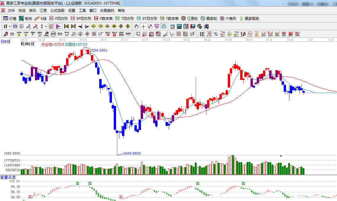 ☆依據(jù)贏家江恩系統(tǒng)乾坤K線提示:藍(lán)色K線為休息區(qū),跌破短期出局線反抽概率減??;