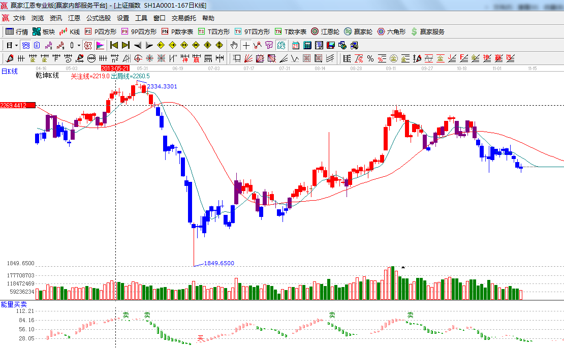 ☆依據(jù)贏家江恩系統(tǒng)乾坤K線提示:藍色K線為休息區(qū),出局線、關注線空頭排列;