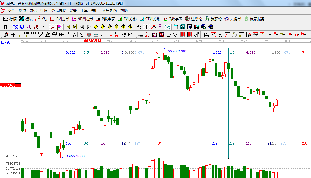 ★依據(jù)贏家江恩系統(tǒng)波段百分比延伸提示:黃金分割價(jià)格圖0.5位置是2090,0.382位置是2049;
