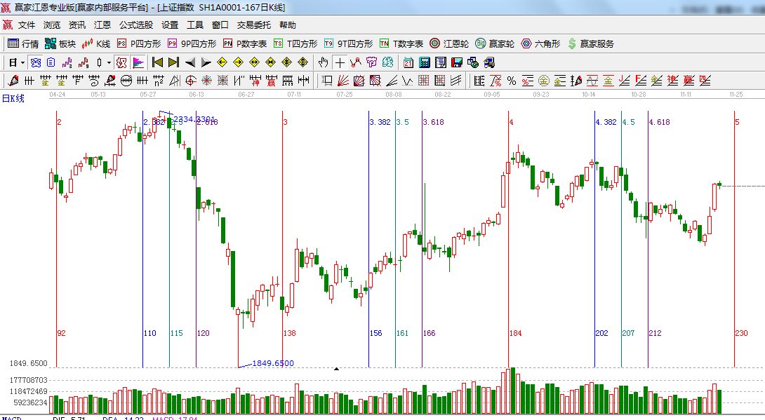 ☆依據(jù)贏家江恩系統(tǒng)波段百分比延伸提示:黃金分割價(jià)格圖0.236位置是2219點(diǎn),0.382位置是2050點(diǎn);