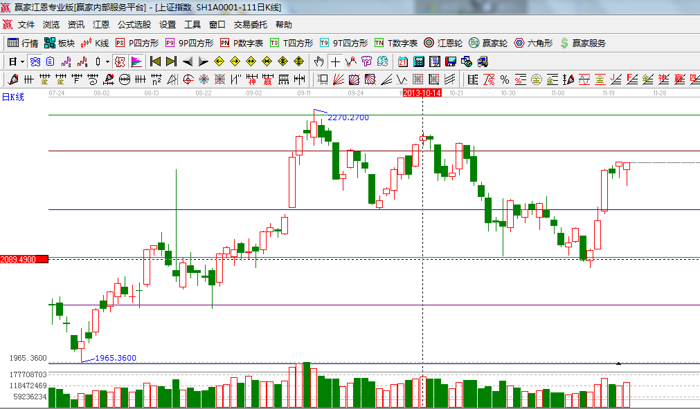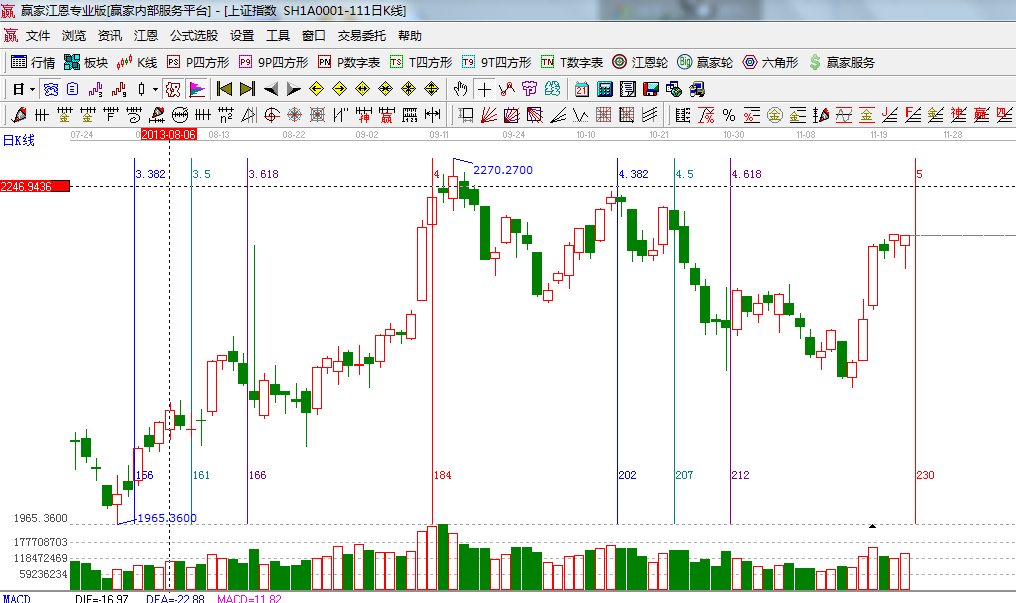 ☆依據(jù)贏家江恩系統(tǒng)波段百分比延伸提示:黃金分割價格圖0.236位置是2219點,0.382位置是2050點;