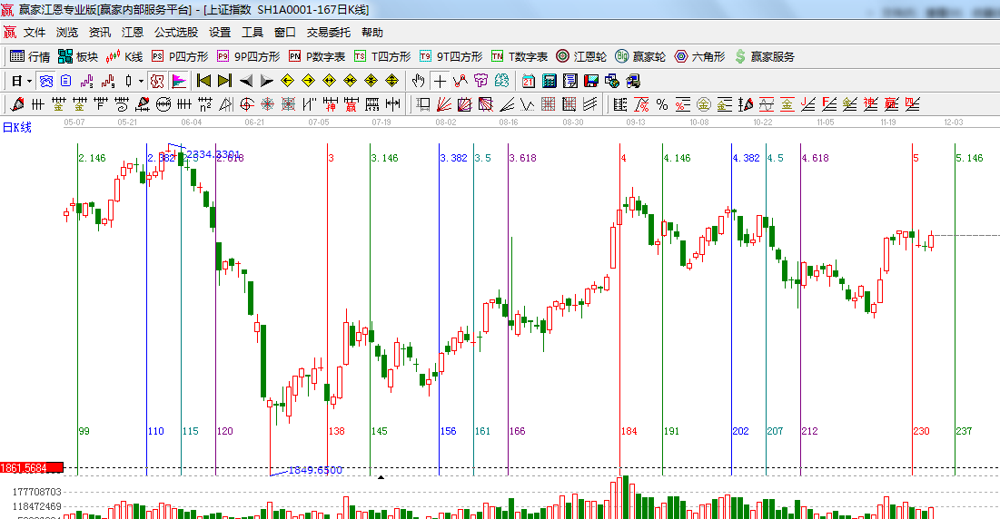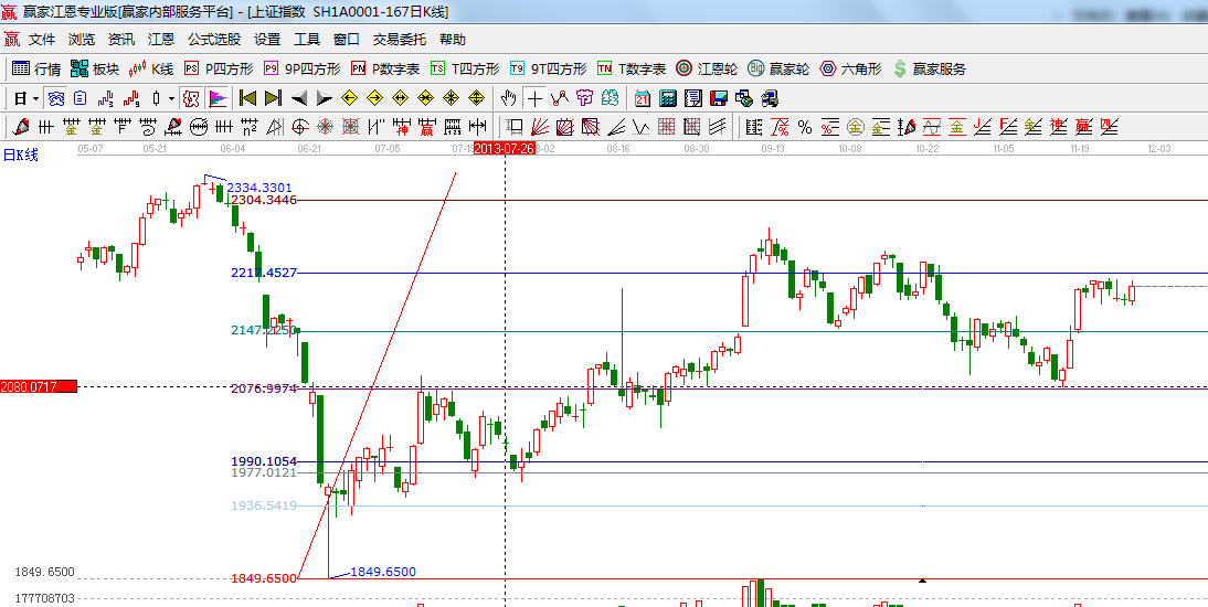 ☆依據(jù)贏家江恩系統(tǒng)波段百分比延伸提示:2444與1849點(diǎn)做黃金分割價格圖,0.382位置是2217點(diǎn),0.5位置是2150點(diǎn);