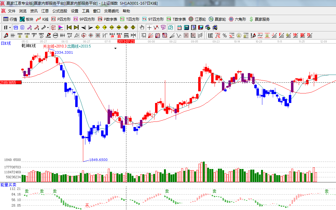 ★依據(jù)贏家江恩系統(tǒng)乾坤K線提示: 紅色K線收盤在關(guān)注線上、繼續(xù)看多;