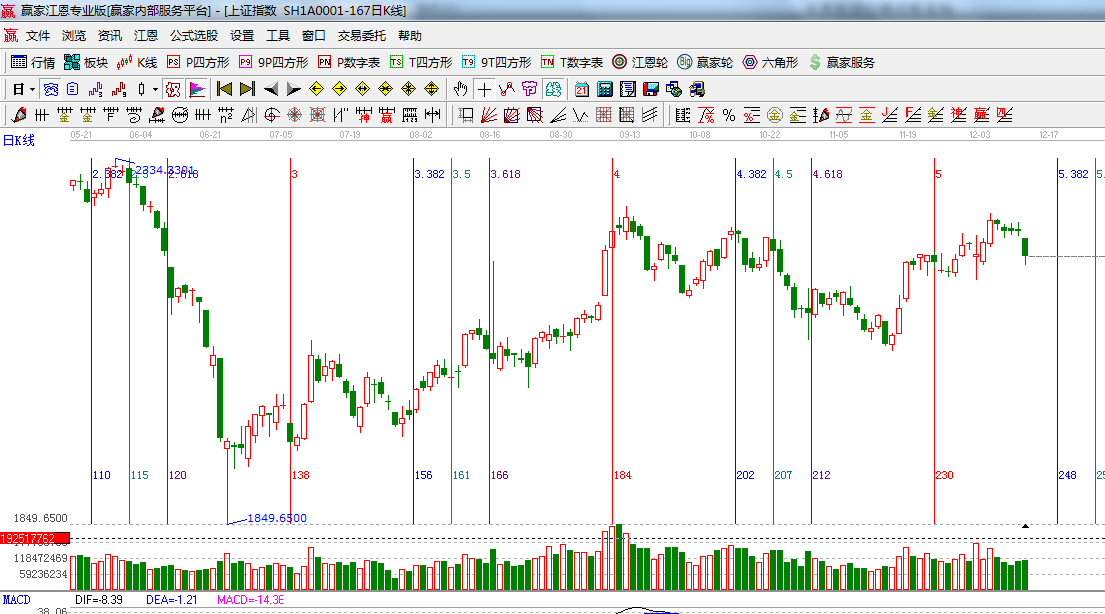 ☆依據(jù)贏家江恩系統(tǒng)波段百分比提示:跌破62.5%與66.67%區(qū)間,50%的位置是2150;
