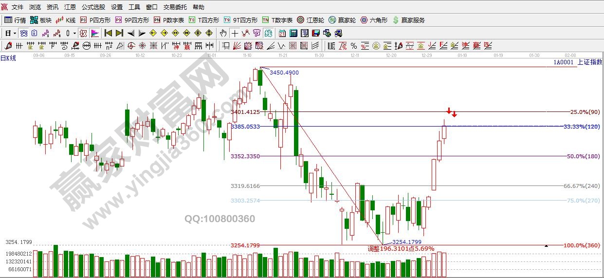 江恩看盤綜述:依據(jù)贏家江恩技術(shù)工具分析得出:周四,指數(shù)再創(chuàng)近期反彈新高,但市場(chǎng)展開分化,在“兩桶油”的強(qiáng)拉升下,指數(shù)也呈現(xiàn)上漲乏力跡象。依據(jù)百分比分析,指數(shù)連續(xù)上攻已經(jīng)接近前期套牢區(qū),點(diǎn)位在3385--3400區(qū)間(百分比120度--90度之間),預(yù)計(jì)短期指數(shù)或?qū)_高回落,結(jié)束短期反彈走勢(shì),回調(diào)空間需要關(guān)注其力度和市場(chǎng)承接性,支撐關(guān)注日線生命線3345點(diǎn)附近。所以,不建議再次追進(jìn),同時(shí)逢高適當(dāng)減倉(cāng)下等待回落低吸良機(jī)。