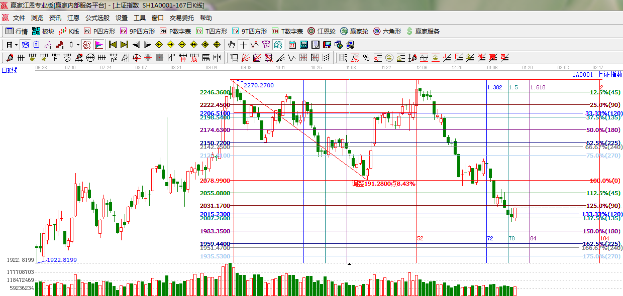 綜上所述:依據(jù)贏家江恩技術(shù)工具分析得出,時間之窗附近指數(shù)在弱勢下軌支撐如期出現(xiàn)探底回升走勢,量能比昨日略微放大,但整體仍處于地量水平,明天關(guān)注量能能否持續(xù),否則謹防沖高回落,上方阻力位關(guān)注江恩90度2031,,45度2055點,操作方面,可適當提高倉位,謹慎做多,星級風險提示,謹慎做多,