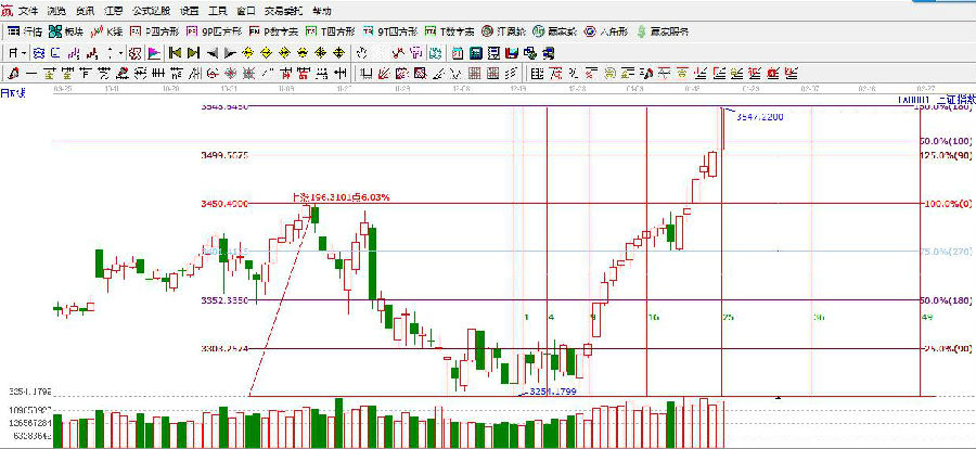 ★依據(jù)贏家江恩理論系統(tǒng)江恩波段百分比提示:昨日突破3500點(diǎn),今日繼續(xù)高開(kāi)高走,接近昨天提到的阻力位3450點(diǎn)。接下來(lái)關(guān)注此位置的爭(zhēng)奪,支撐3500點(diǎn)。