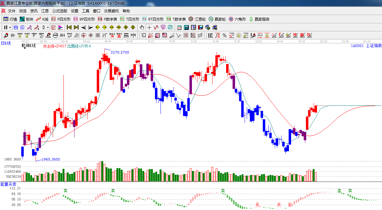 ★依據(jù)贏家江恩系統(tǒng)乾坤K線提示:紅色可操作區(qū)域,出局線上方,看多?! ?br />   ☆依據(jù)贏家江恩系統(tǒng)能量買賣提示:紅色能量柱有縮短跡象,短期謹(jǐn)慎。
