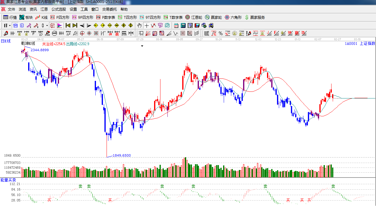 ★依據(jù)贏家江恩系統(tǒng)乾坤K線提示:破位綠色短線出局線,短線看空,波段看多。
