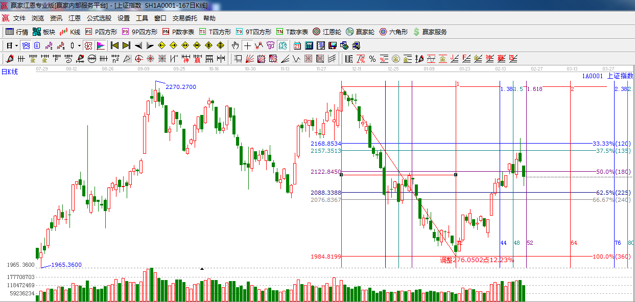 ☆依據(jù)贏家江恩系統(tǒng)黃金時(shí)間周期線提示:周一2月24日是上周提到的日線時(shí)間窗口(黃金時(shí)間1.618的時(shí)間窗口)多加關(guān)注盤面變化。