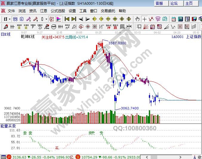 ☆依據(jù)贏家江恩理論系統(tǒng)乾坤K線提示:藍(lán)K線波段看空,K線跳空低開(kāi)在短期出局線下。