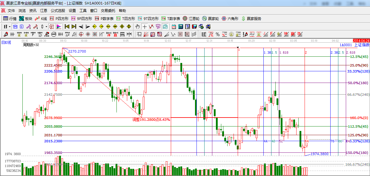 綜上所述:依據(jù)贏家江恩技術(shù)工具分析得出:今日在權(quán)重的帶領(lǐng)下,反抽江恩90度2031點(diǎn),與今天最高點(diǎn)僅2點(diǎn)之差,量能方面較昨日基本持平,短期的上漲仍屬于超跌反彈性質(zhì)的,市場(chǎng)整體流動(dòng)性不具備扭轉(zhuǎn)弱勢(shì)格局的能力,因此操作上,保持一定謹(jǐn)慎態(tài)度。星級(jí)風(fēng)險(xiǎn)提示,看空(物極必反,看空不做空)。