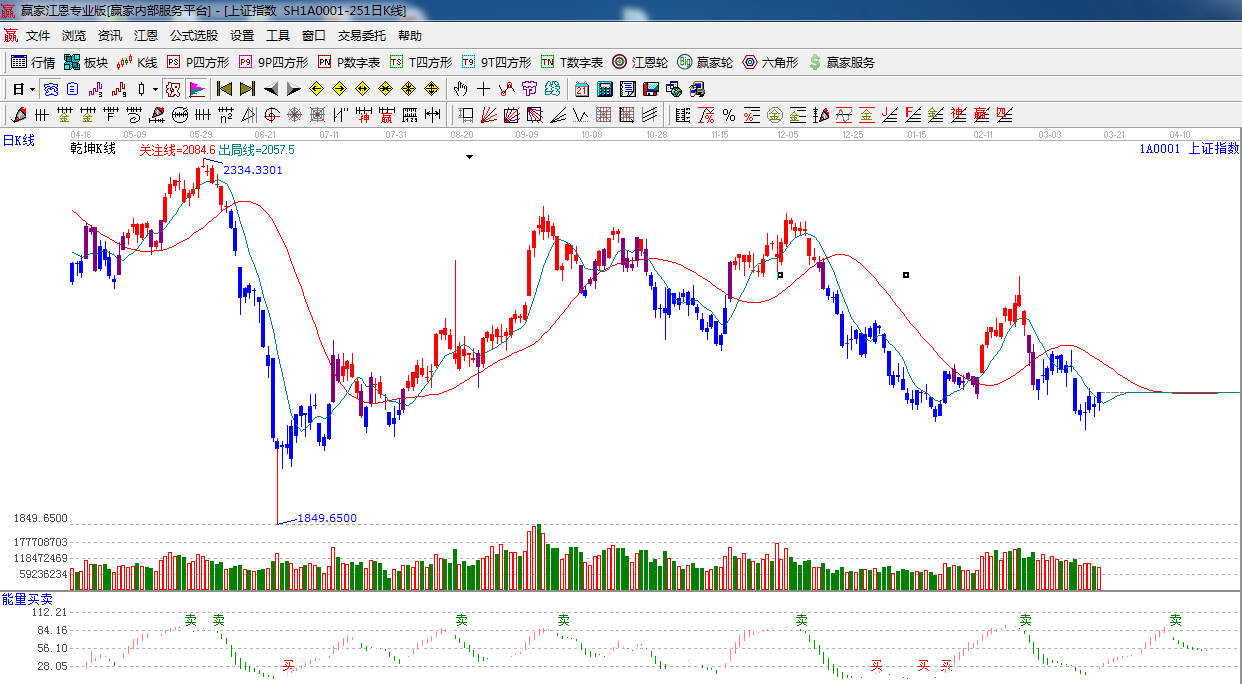 ☆依據(jù)贏家江恩系統(tǒng)乾坤K線提示:藍色休息區(qū),突破出局線,短線看多,波段看空。