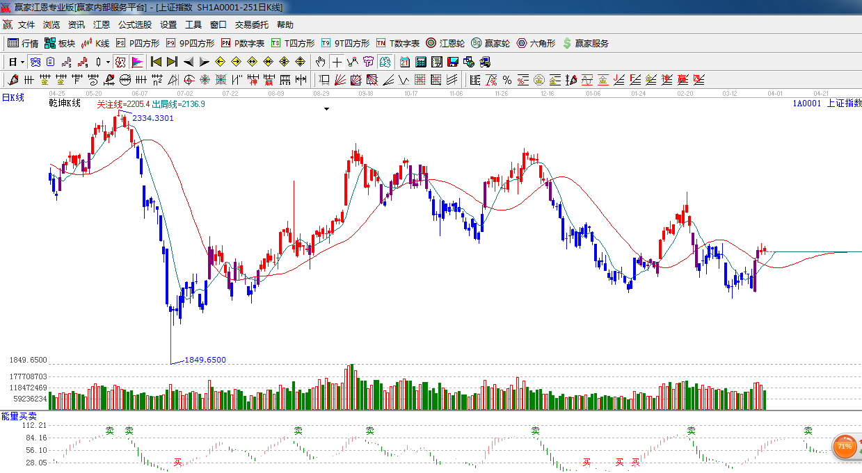 ★依據(jù)贏家江恩系統(tǒng)能量買賣提示:紅色能量柱子,看多。