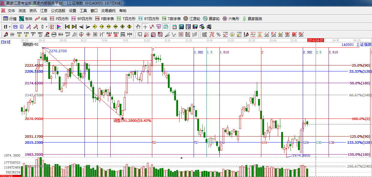 綜上所述:依據(jù)贏家江恩技術(shù)工具分析得出:大盤依然處于0度位置2078點下方做震蕩整理,量能較昨日明顯縮小,支撐看生命線2049點,此位置不破,整體上行趨勢不變,破位將會去考驗90度2031點位置,周四大盤繼續(xù)弱勢震蕩整理為主。操作上,倉位控制5成左右。星級風險提示,看多。