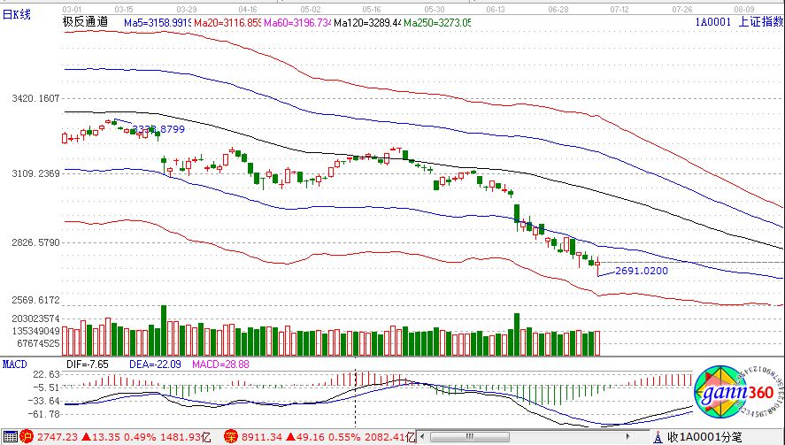 滬指漲0.49%,報2747點;深成指漲0.55%,報8911點;創(chuàng)業(yè)板指漲0.56%,報1541點。盤面上看,農林牧漁、鄉(xiāng)村振興、水泥、無人零售、芯片、數(shù)字中國等板塊漲幅居前;在線旅游、互聯(lián)網(wǎng)彩票、啤酒、ST板塊、粵港澳大灣區(qū)、知識產權保護。滬股通凈流入27億,深股通凈流入18億。相應的極反通道指標的支撐壓力提示,如下圖所示: