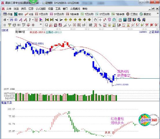 ☆依據(jù)贏家江恩理論系統(tǒng)乾坤K線提示:藍(lán)色K線,波段趨勢仍為空。