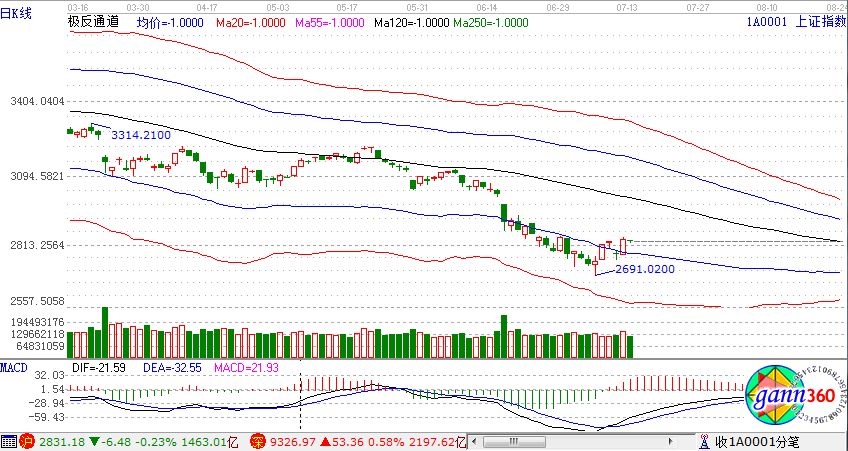 滬指跌0.23%,報收2831.18點;深成指漲0.58%,報收9326.97點;創(chuàng)業(yè)板漲0.24%,報收1618.46點。從板塊漲幅上看,白酒、飲料、醫(yī)藥等漲幅居前;農(nóng)林、紡織、計算機、軍工等跌幅居前。相應的極反通道指標的支撐壓力提示,如下圖所示: