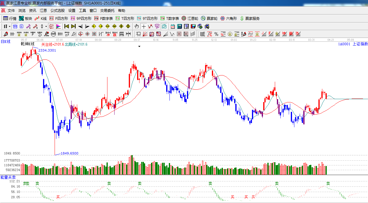 ☆依據(jù)贏家江恩系統(tǒng)能量買賣提示:處于紅色柱子轉(zhuǎn)入綠色柱子的臨界點,并出現(xiàn)“賣”字信號,短線 看空。