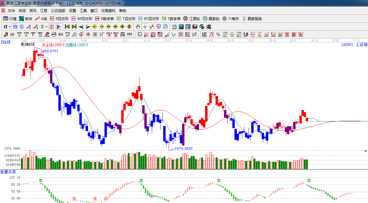 ★依據(jù)贏家江恩系統(tǒng)乾坤K線提示:k線,破位短線出局線,處于關(guān)注線之上,紅色可操作區(qū)域,短空波多。