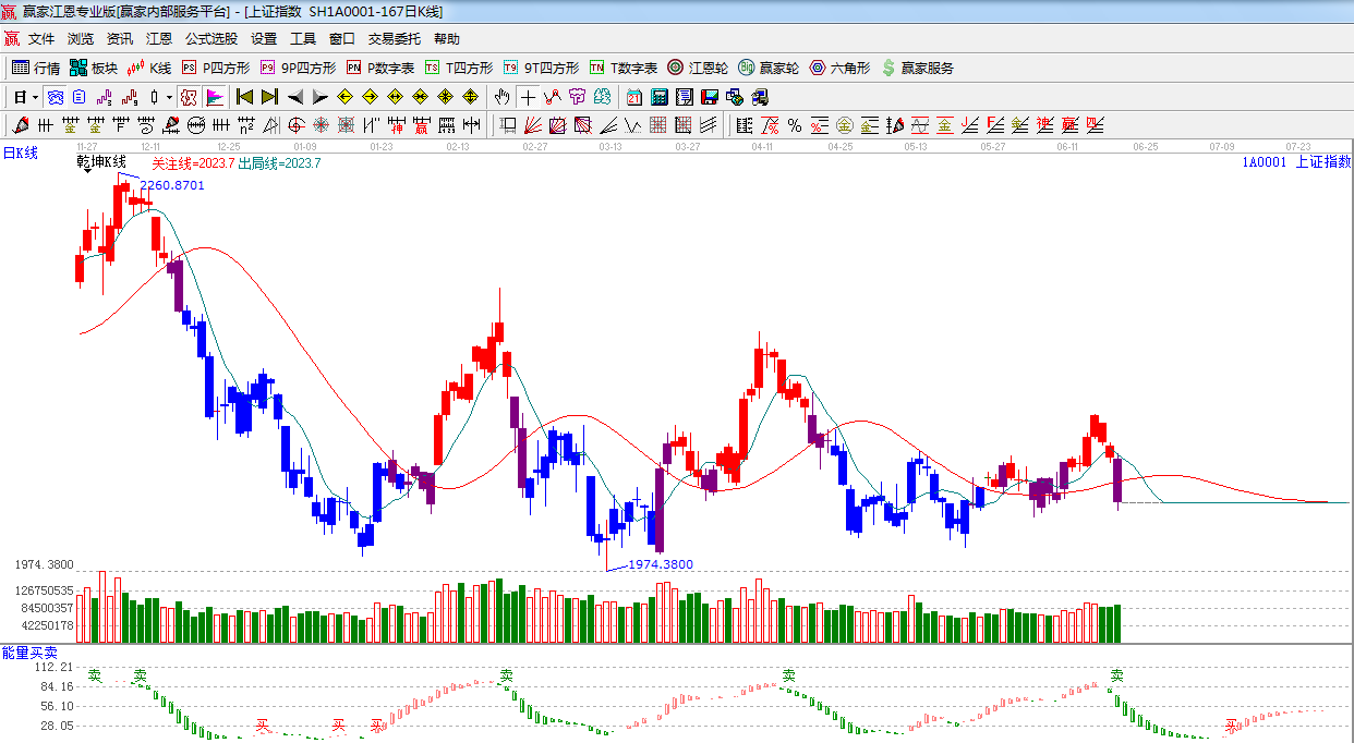 ☆依據(jù)贏家江恩系統(tǒng)乾坤K線提示:紫色k線,警示信號(hào),同時(shí)破位關(guān)注線,看空。