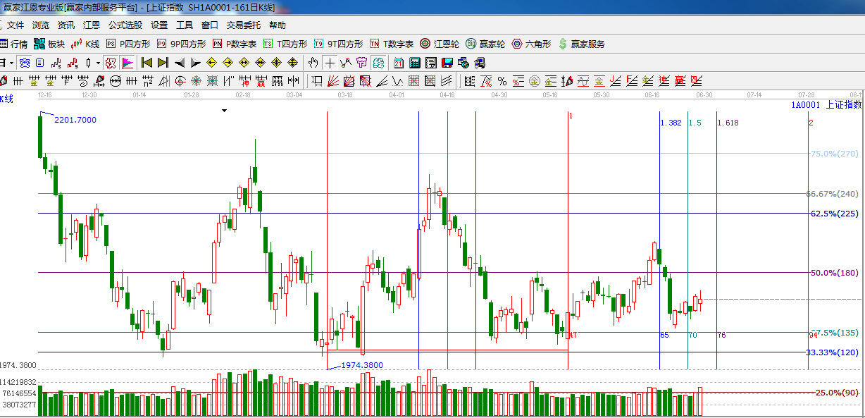 江恩看盤綜述:依據(jù)贏家江恩技術(shù)工具分析得出:周五生命線遇阻回落,收陰十字星,量能有所放大,生命線2040不能突破短期依然震蕩整 理或小幅下探,本周時間窗口7月2日附近,有望給出短期方向,操作上,倉位控制在3-5成。