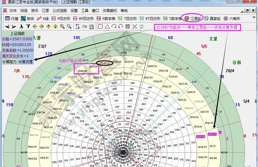 ☆依據(jù)贏家江恩理論系統(tǒng)江恩輪中輪提示:以3587為起點(diǎn),做江恩輪中輪時(shí)空分析圖。當(dāng)前受阻2615壓力點(diǎn)引發(fā)回落,空間上看將繼續(xù)確認(rèn)2540點(diǎn)支撐。