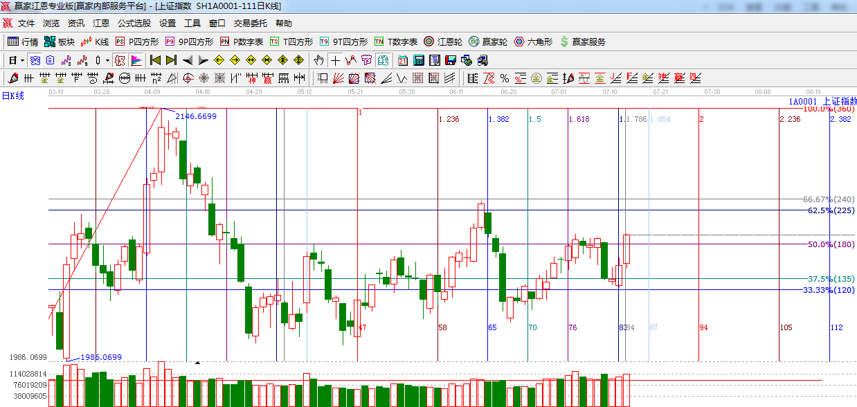 ☆依據(jù)贏家江恩系統(tǒng)黃金時(shí)間周期線提示:時(shí)間窗口為7月11日,14日,下周關(guān)注17號(hào)。