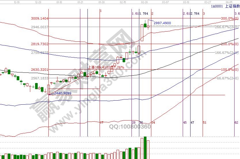 28號是大盤日線時間窗口,繼續(xù)觀察市場橫盤后短線方向選擇,依據(jù)規(guī)則紅色外軌線為短線風(fēng)險區(qū),空間點位上,江恩百分比、價格四方形顯示,28號2914、2925點為支撐,2974、2999點為壓力,3月份第一個時間窗口是7號。操作策略,大盤日K線突破紅色外軌線,注意時間窗口后遇反壓力風(fēng)險,持股上享受瘋狂的同時不斷提高止賺位策略,即保護了利潤又可將利潤最大化,或主動分批高拋紅色外軌線個股,拋售倉位等待市場回歸通道內(nèi)在做決策是否參與,整體倉位保持在6成左右。