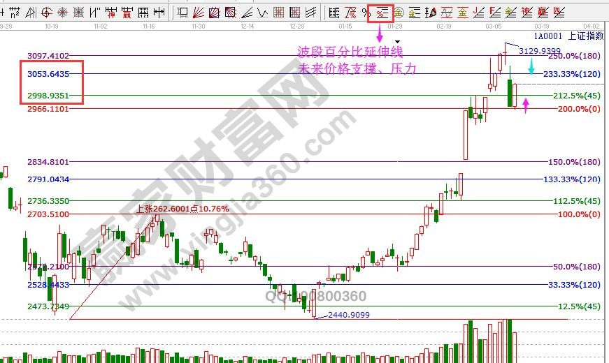 ☆依據(jù)贏家江恩理論系統(tǒng)波段百分比延伸線提示:以2440點(diǎn)為起點(diǎn),2703點(diǎn)為終點(diǎn)做圖,2倍零度位2966點(diǎn)同盤(pán)中最低僅相差3個(gè)點(diǎn),明日盤(pán)中關(guān)注45度2998點(diǎn)支撐,120度3053點(diǎn)為壓力。
