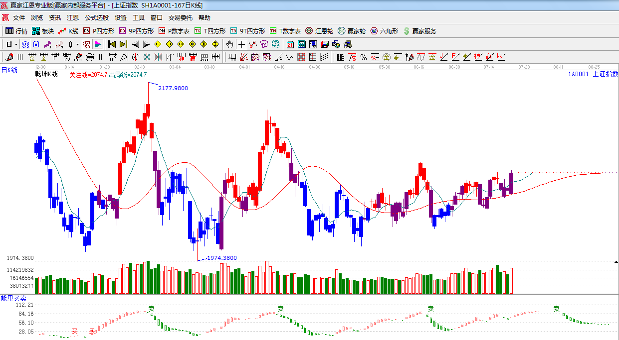 ★依據(jù)贏家江恩系統(tǒng)乾坤K線提示: 關(guān)注線位置拉起中陽線,紫色k線,警示信號,謹慎為主。