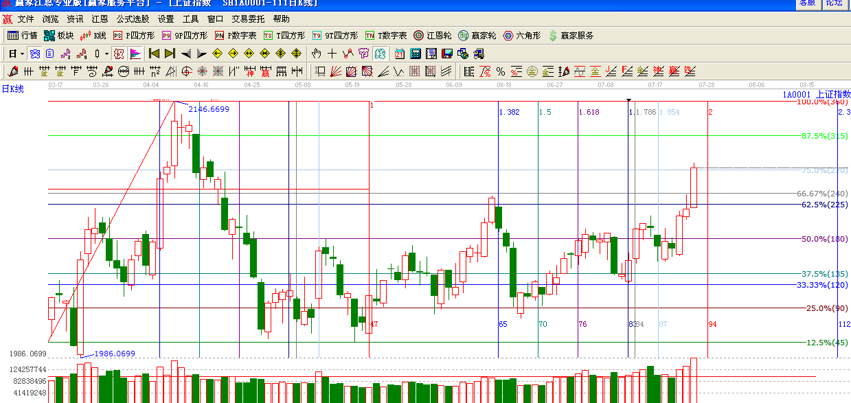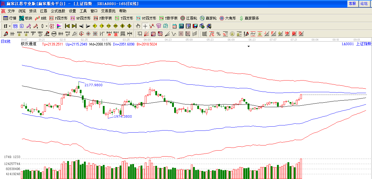 江恩看盤(pán)綜述:依據(jù)贏家江恩技術(shù)工具分析得出:在權(quán)重的帶動(dòng)下,放量突破年線(xiàn),站上2100點(diǎn),目前接近極反通道藍(lán)色外軌線(xiàn)阻力區(qū),預(yù)計(jì)周五高位震蕩為主。日線(xiàn)下一時(shí)間窗口是7月28日,操作上,關(guān)注低位藍(lán)籌股以及受益微刺激的高鐵、核電、特高壓等概念。