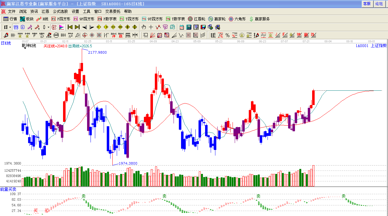 ★依據(jù)贏家江恩系統(tǒng)極反通道提示:在權(quán)重的帶動(dòng)下,攻擊藍(lán)色外軌線(xiàn),外軌線(xiàn)阻力2120點(diǎn)。