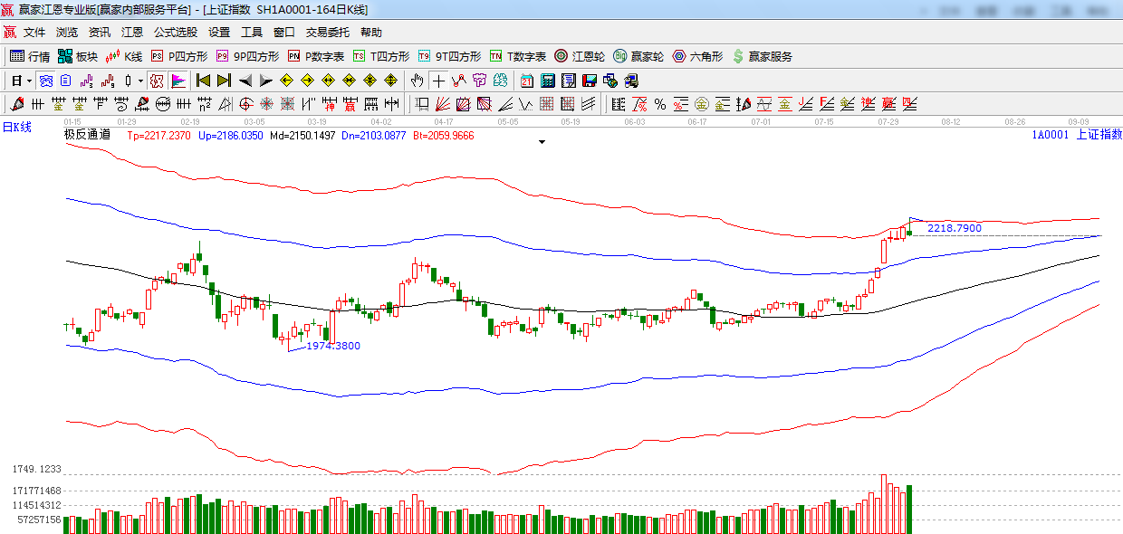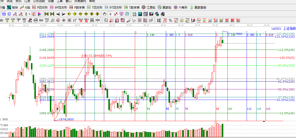 江恩看盤(pán)綜述:依據(jù)贏家江恩技術(shù)工具分析得出:周五指數(shù)在極反通道外軌阻力線(xiàn)遇阻回落,收倒垂頭線(xiàn),量能同比放大,預(yù)計(jì)大盤(pán)短期將小幅下探,下方強(qiáng)支撐是江恩45度2168點(diǎn),整體看多趨勢(shì)不變,操作上,合理控制倉(cāng)位,做好高拋低吸。