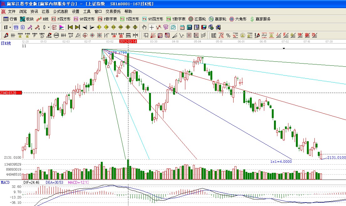 咨詢:13333833889上節(jié)我們簡(jiǎn)單講解贏家江恩角度線畫法及公式,本節(jié)內(nèi)容主要介紹贏家江恩角度線用法,明白了角度線的制作原理,通過(guò)鼠標(biāo)單擊指標(biāo)可將角度線快速的畫出,線與線之間的關(guān)系我們進(jìn)一步講解;