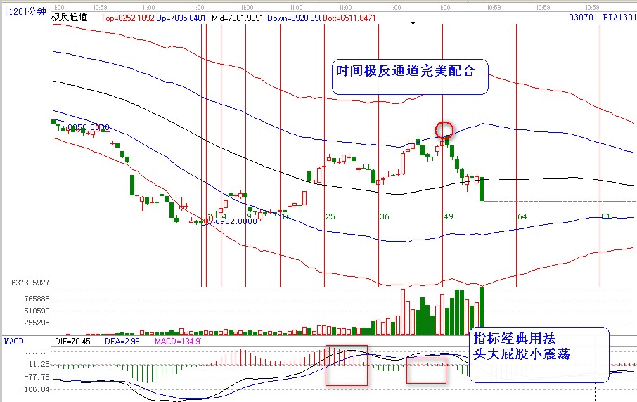 第一次遇到極反通道上軌壓力回踩,再次上攻遇到時間49【7*7=49】無功而返。指標(biāo)出現(xiàn)了柱子背離。3線共振