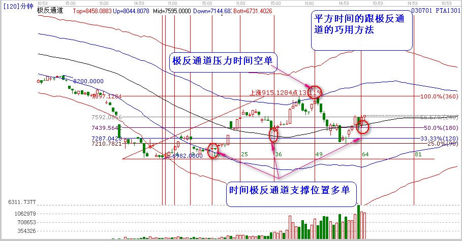 我們?cè)趤?lái)看pta日線級(jí)別的一個(gè)位置,pta見底以來(lái)運(yùn)行的時(shí)間周期平方時(shí)間,在每次的高點(diǎn)點(diǎn)演繹了重要的位置,明天就是pta的低點(diǎn)來(lái)的36天【6*6平方時(shí)間】處于極反通道生命線附近。