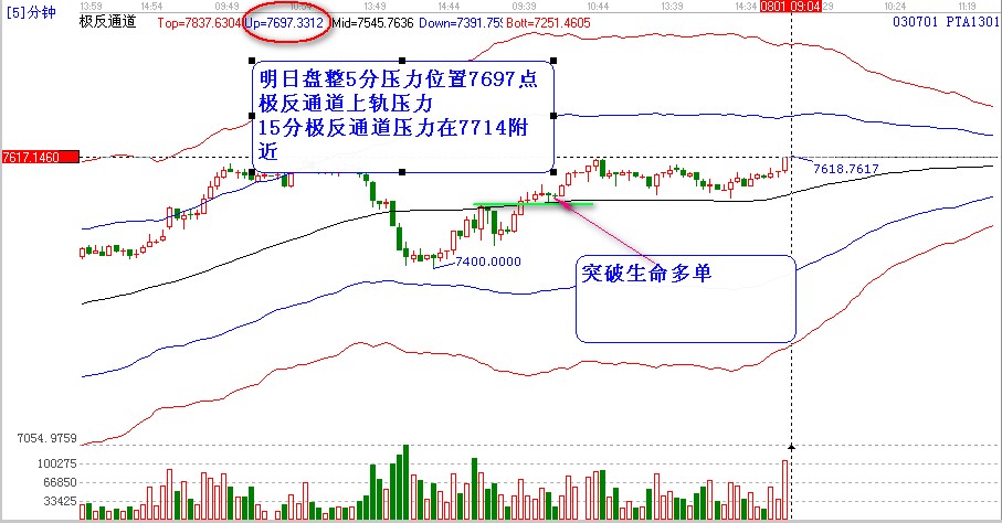 5 分鐘時(shí)間周期看pta:也是在突破極反通道生命線后的回踩然后開始的上攻,按照極反通道買賣規(guī)則,生命線不破看高一線,目標(biāo)就是5分的極反通道上軌。