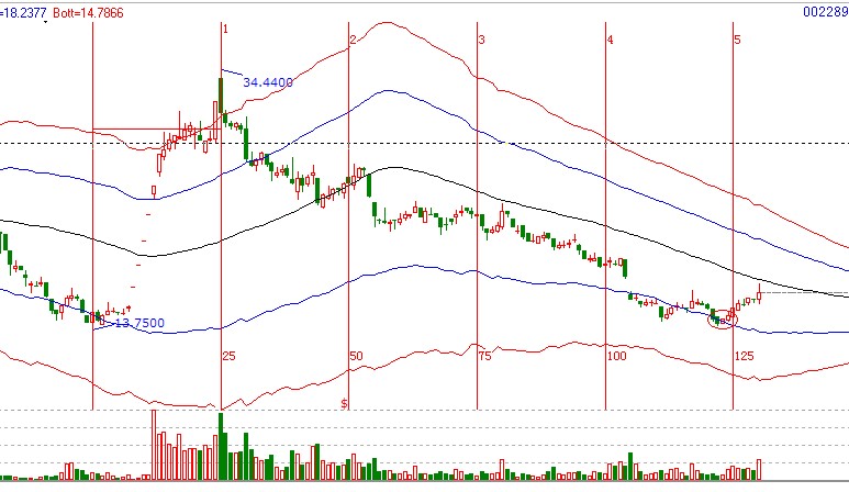 【002289】2012年1月17號至2012年3月7號25個交易日漲幅達150%,使用贏家江恩時間工具黃金分割周期圖做圖,結(jié)果如圖2012年8月3號是第5個循環(huán)的結(jié)束點,同時價格在極反通道弱勢外軌線位置,時間價格達成共振及為操作點;