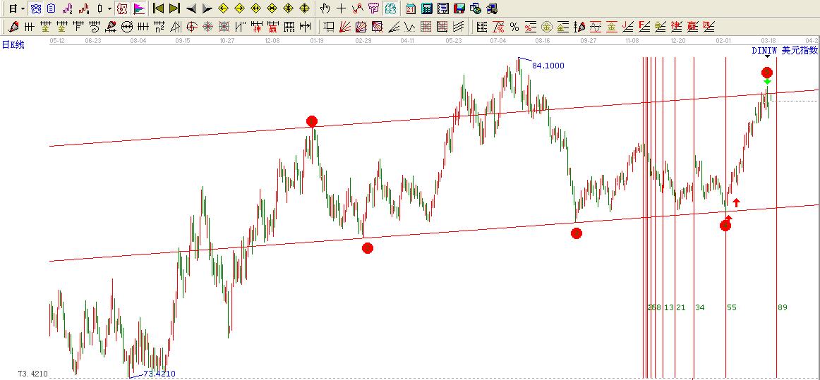 美元指數(shù)在(1)位置2012-01-13日高點81.784 跌至(2)位置2012-02-29日低點78.095點創(chuàng)出了新高然后在出現(xiàn)重要的低點(3)2012-09-14日低點78.601這3個重要的點位連接構(gòu)成了一個面。美元指數(shù)在(4)2013-02-01日見底78.918后然后上行,就是止跌于這一條提前畫出去的線。這一波的上揚一下子就到了(5)2013-03-14日高點83.166點這里的位置剛好也在其通道的壓力位置。按照通道低位做多的嗎美元指數(shù)就要在這個位置開始平掉多單然后轉(zhuǎn)手空頭了。 而這一波的起漲位置是有其81.45點高點2012-11-16日跌至其55時間 78.9182013-02-01日開始的上揚。而55時間后就是其89.這個時間窗口處于2013-03-22日這里一旦構(gòu)成頂部那么美元指數(shù)下跌是必然而不是偶然。